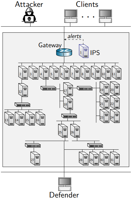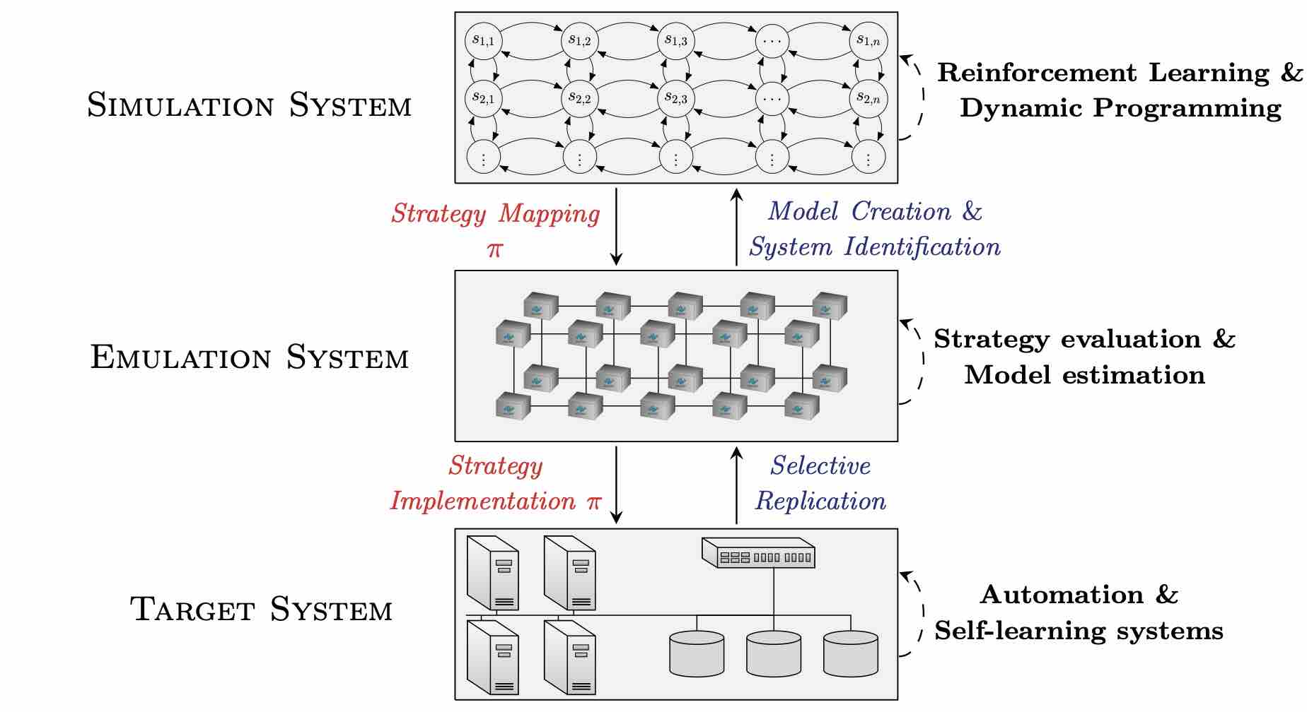 This method includes two systems: an emulation system and a simulation system. The emulation system closely approximates the functionality of the target infrastructure and is used to run attack scenarios and defender responses. Such runs produce system measurements and logs, from which infrastructure statistics are estimated, which then are used to instantiate Markov decision processes (MDPs).