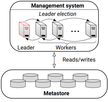 The management system is the central component of CLSE and manages the overall execution of the framework. It is a distributed system that consist of N>=1 physical servers connected through an IP network. One of the servers is designated to be the "leader" and the other servers are "workers". The management system can be used to monitor emulations in real-time, to start or stop services, to monitor reinforcement learning workloads, to access terminals of emulated components, and to examine security policies.