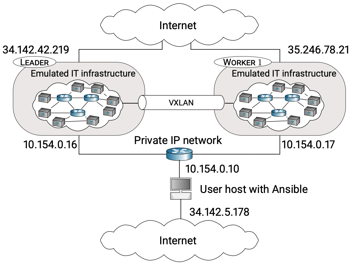 Figure 26: Network topology of a typical CSLE installation; the cluster consists of a leader and zero or more workers; the installation commands are executed from an external user host that runs Ansible; the servers are connected through a private network as well as to the Internet; the user host has access to the private network.