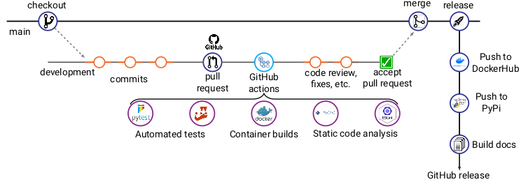 We use continuous integration (CI) with GitHub Actions to build the project and run tests on every pull request submitted to CSLE. The CI pipeline used in CSLE is illustrated in Fig. 30. Developers make commits on a branch that is separated from the master/main branch. Once a developer has completed a bugfix or a new feature, he/she submits a pull request to GitHub. The pull request then triggers a set of automated tests and automated builds using GitHub actions. If all automated tests pass, the pull request undergoes code review, otherwise the developer has to fix the failing tests or builds. Finally, when the code review and associated fixes are completed, the pull request is merged into the main/master branch and may optionally trigger a release pipeline where build artifacts are pushed to code servers (i.e., DockerHub and PyPi).
