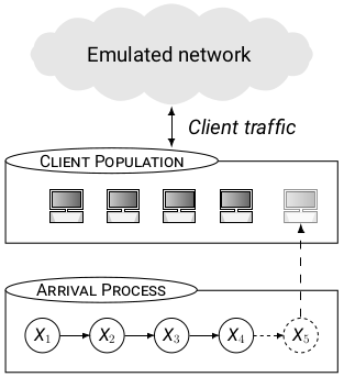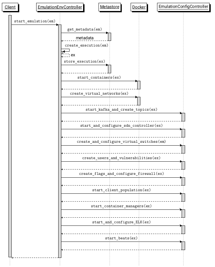 An emulation execution corresponds to a set of running Docker containers and virtual networks. Starting an execution takes around 10-15 minutes. To start an execution, the emulation system first reads the emulation configuration from the metastore and starts the containers that are described in the configuration. Once the containers have started, the emulation system applies the emulation configuration. This step involves executing a sequence of Remote Procedure Calls (RPCs) through the gRPC API described above, e.g., RPCs to create user accounts, to start services, and to configure services (see Fig. 15).