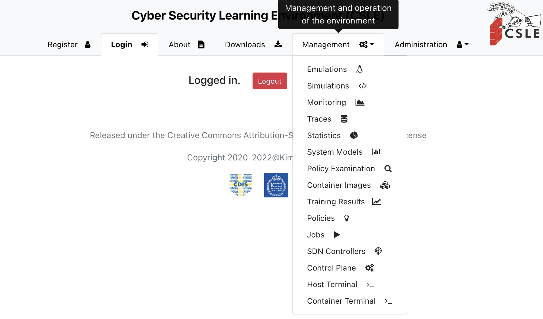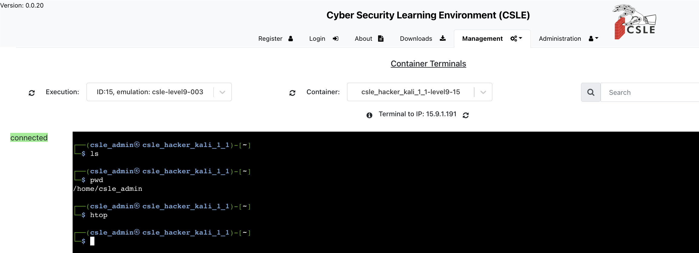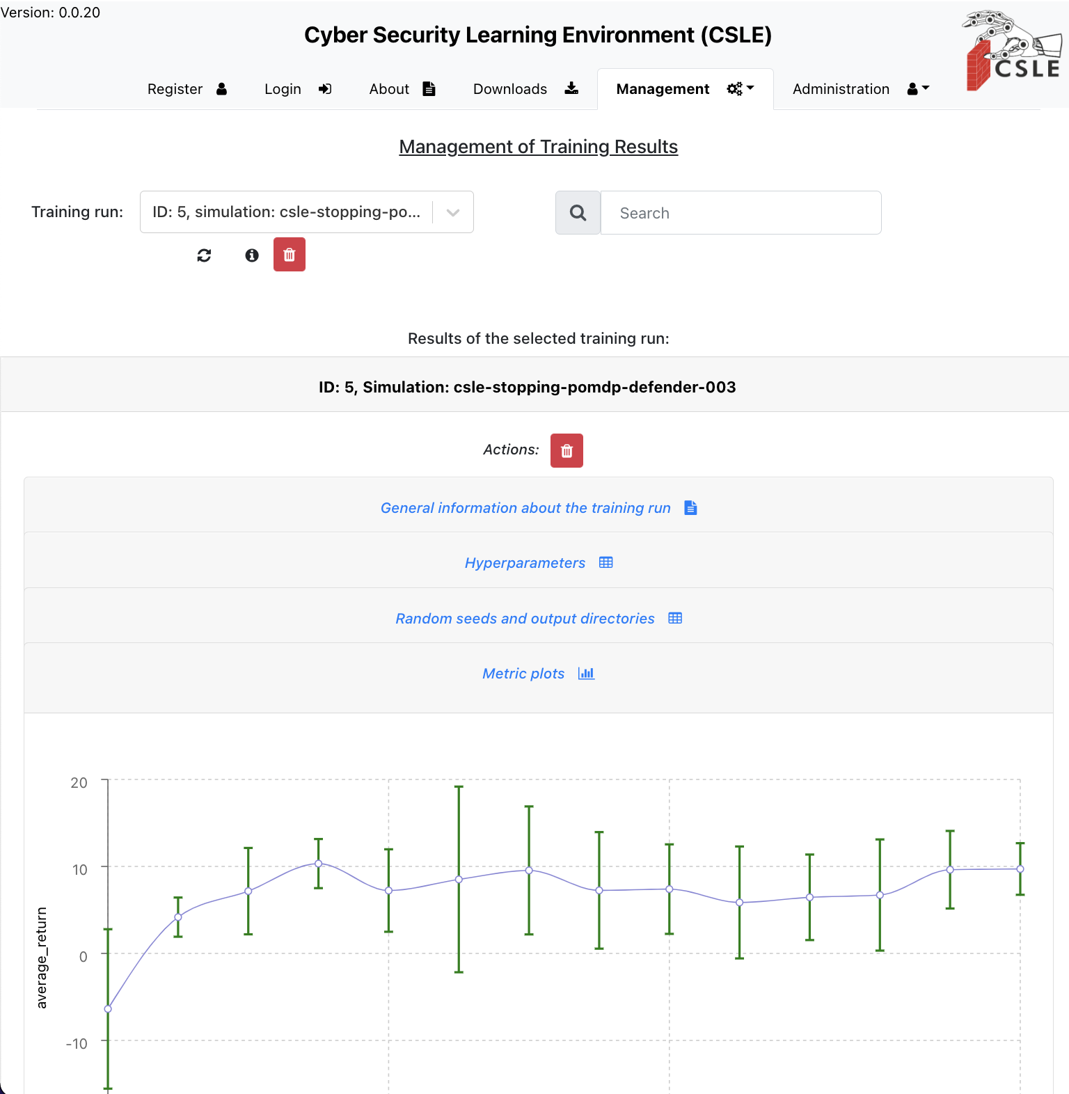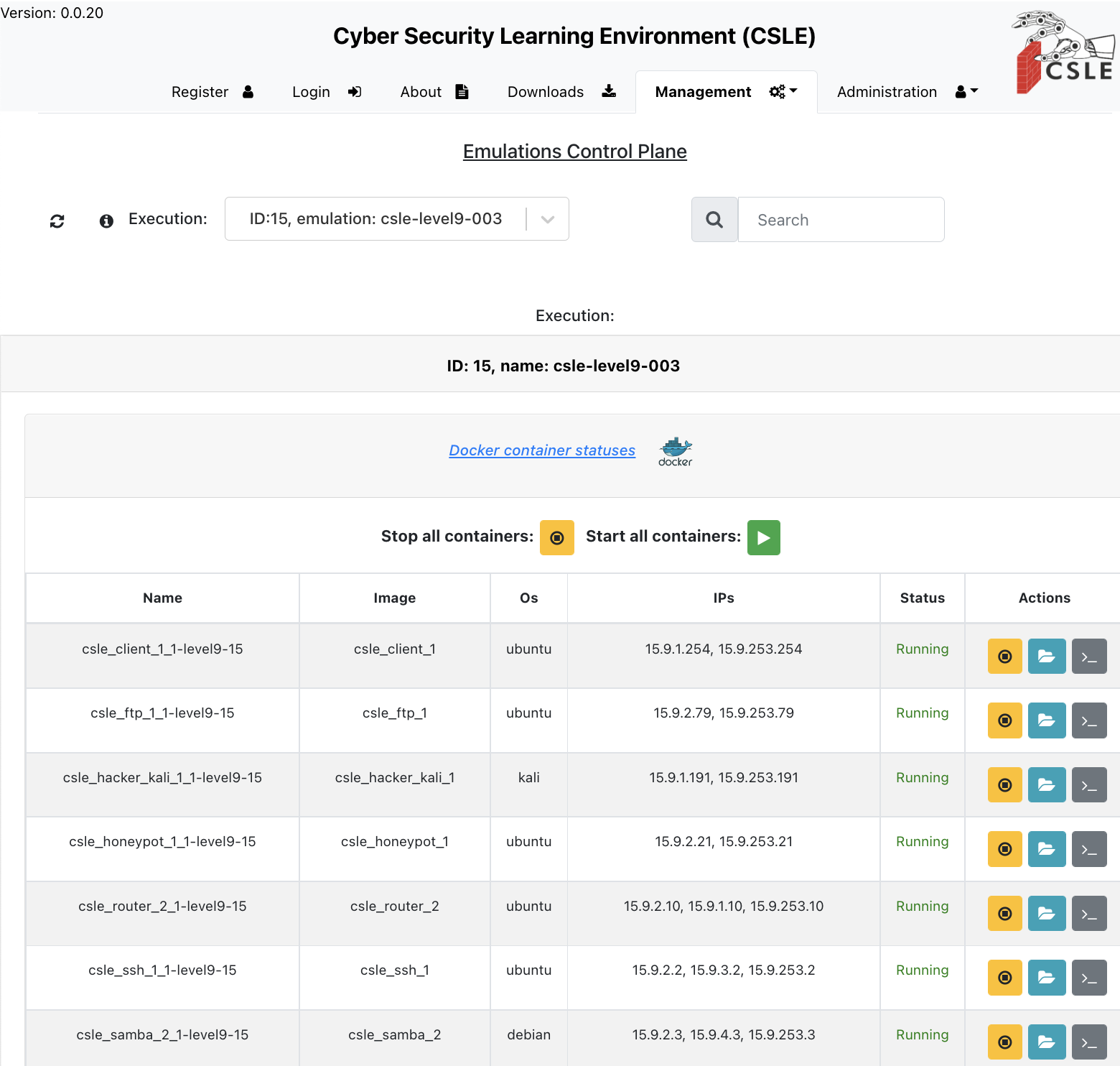 The web interface of CSLE can be used to view management information and to request management operations (see Fig. 17).** It can also be used to monitor emulations in real-time (see Fig. 18 and Fig. 19), to start or stop services (see Fig. 20), to monitor reinforcement learning workloads (see Fig. 21), to access terminals of emulated components (see Fig. 22), and to examine security policies (see Fig. 23).