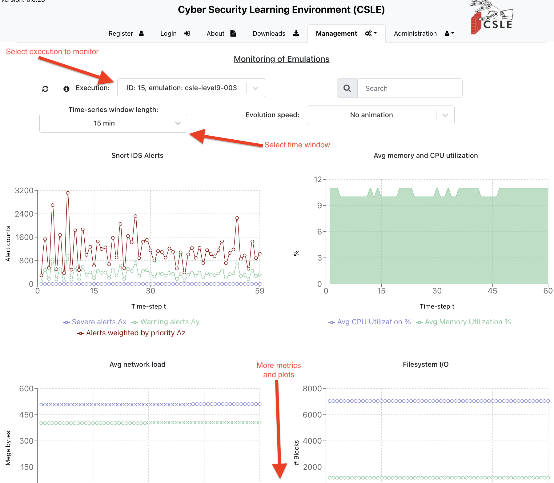 Figure 18: The monitoring page of the web interface; this page allows a user to view system metrics of a given emulation execution in real-time.