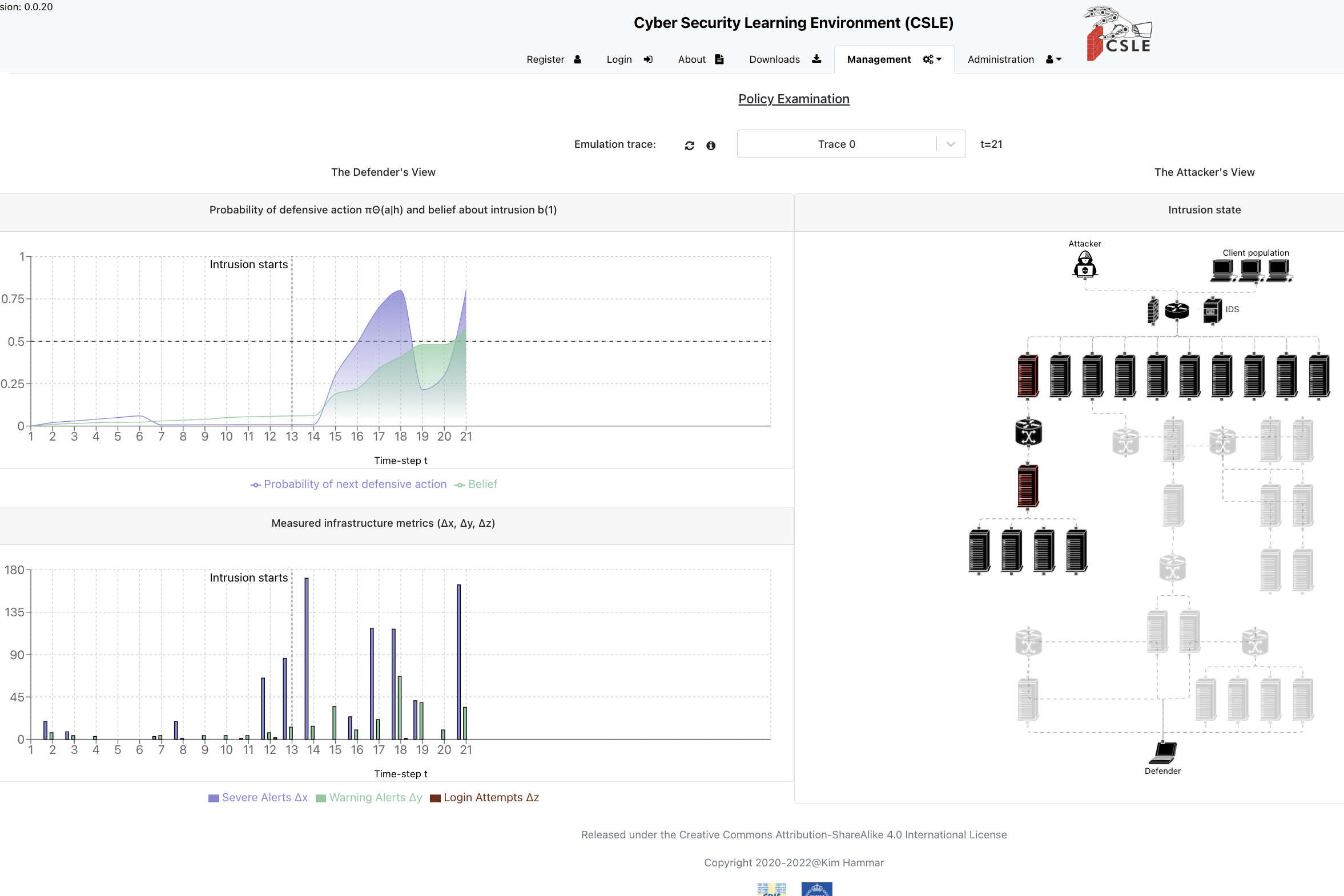 Figure 23 pictures the main user interface of the policy examination system. The left part of the interface shows the defender’s view and the right part shows the attacker’s view. The plot on the upper left shows the defender’s belief about the infrastructure’s state and the probability that the defender takes an action at each time-step. The plot on the lower left shows the distribution of infrastructure metrics that the defender observes. The graphic on the right shows the attacker’s view, depicted as an overlay on the IT-infrastructure’s topology.