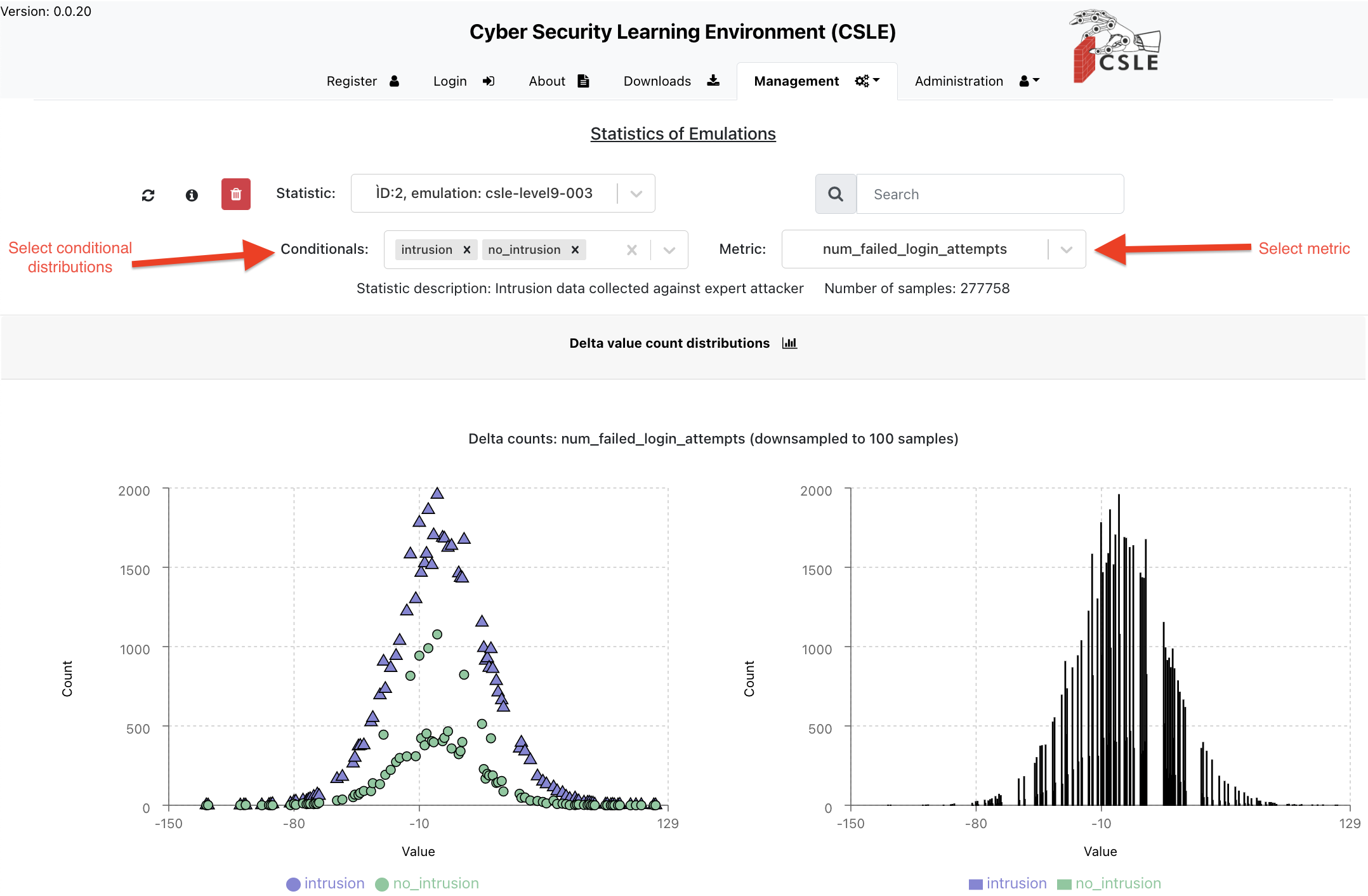 Figure 19: The statistics page of the web interface; this page allows a user to view empirical statistics of emulated infrastructures, e.g., empirical distributions of system metrics.