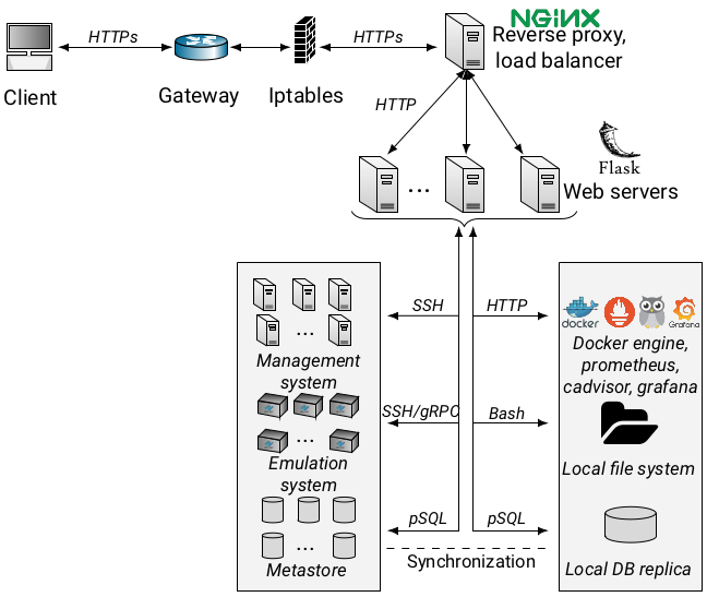 The web interface is implemented by a web application written in JavaScript and the React framework, which executes on the management system. Each physical server of the management system runs a Flask web server that exposes an HTTP REST API (the REST API is detailed in the subsequent section). In front of these web servers is a Nginx reverse proxy that load balances client requests, decrypts incoming HTTPS traffic, and encrypts outgoing HTTP traffic using TLS (see Fig. 24).