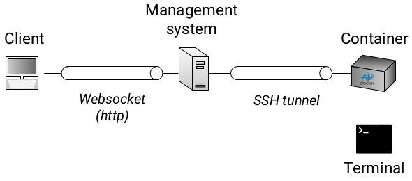 Figure 25: Architecture diagram of the web-based terminal emulation in CSLE; the web application in the client's browser opens a web socket to an HTTP server running on one of the physical servers of the management system; the web server then pipes the websocket to an SSH tunnel that connects to a terminal of the emulated component.